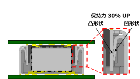 プラグ側に凸形状、リセプタクル側に凹形状を施し、しっかりと嵌合できるロック構造とすることで、保持力が弊社従来品と比べ30%向上する高い堅牢性を実現しました。また、プラグ側、リセプタクル側のそれぞれに嵌合時の誘い込みに効果的なR形状を採用し良好な作業性を実現しています。