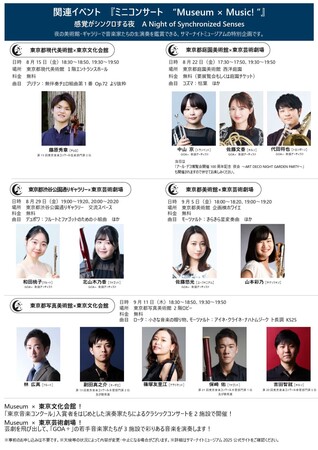 都立文化施設のコラボレーションイベントとして、東京文化会館、東京芸術劇場が企画制作するコンサートを、美術館・ギャラリーで開催します。感覚がシンクロする夜をお楽しみください。