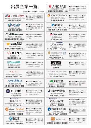 出展企業(計25社・1団体):県内外のクラウドサービス提供企業、DXコンサル企業、人事労務・会計管理ツール提供企業等