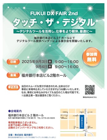 福井新聞社では、福井県、株式会社福井銀行などとともに参画する「ふくいデジタル推進アライアンス」において、企業向けのデジタルツールを紹介する展示会 「FUKUI DX FAIR 2nd ~タッチ・ザ・デジタル~」を2025年9月3日(水)・4日(木)の2日間、福井銀行本店(福井市)で開催します。「デジタルツールを活用し、仕事をより軽快、最適に」をテーマに、クラウドサービス提供企業やDXコンサル企業、人事労務・会計管理ツール提供企業など、福井県内外から25社・1団体が出展。デジタルツールによる業務改善や生産性向上に取り組むきっかけとなる機会を創出します。