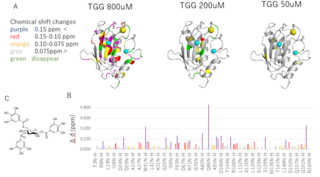 A: TGGの各濃度を作用させたときのNMRシグナル(ケミカルシフト)が変化した箇所を色付けた。タンパク質の色のついたところがタンニンと結合している可能性が高い