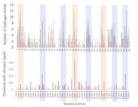 ハイライトした部分は、MDシミュレーションとNMR法の結果が一致した部分。オレンジでハイライトした部分は、距離的に86番目のGlnに近い部位。