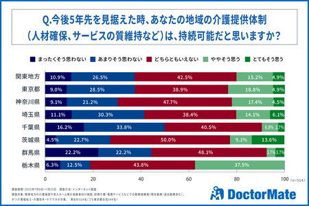 関東の介護職員は、将来の介護提供体制の持続可能性について明確な見通しを持てないでいます。「どちらともいえない」が最も多く、特に茨城、群馬、神奈川で顕著です。千葉、埼玉、東京では否定的な意見が多く、群馬では22.2%が「まったくそう思わない」と悲観的です。