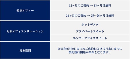 2025年9月30日までに、ザ・コレクティブ グラングリーン大阪のホットデスク、プライベートスイート及びエンタープライズスイートをご成約いただいた場合、ご契約期間に応じて最大2ヶ月分のご利用料金が無料。