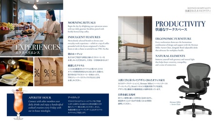 ザ・コレクティブは、「エクスペリエンス」「プロダクティビティ」「サービス」「ウェルネス」の4つの要素を徹底的に磨き上げ、メンバーの皆さまがザ・コレクティブで過ごす時間を、より豊かで価値あるものにすることを目指す、ラグジュアリーコワーキングです。