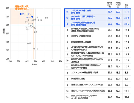 りスピード感のある研究・開発」(期待度と貢献度のスコア差:41.1pt)、「グローバルで戦える技
