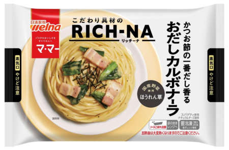 そして、「おしゃれな冷凍パスタ」という新しい世界観で冷凍パスタ市場の活性化に貢献している「マ・マー こだわり食材のRICH-NA(リッチーナ)」シリーズには、「かつお節の一番だし香る おだしカルボナーラ」が新登場。かつお節の一番だしを使用し、だしの香りが豊かに香る和風カルボナーラで、国産ほうれん草と大きめにカットしたベーコンをトッピングしているほか、きざみ海苔の磯の風味が和風な味わいにぴったりの一品です。袋のまま電子レンジへ入れて加熱するだけで食べられるので、忙しい方の食事にもぴったりです。