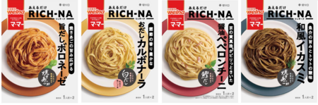 また、この「RICH-NA(リッチーナ)」シリーズは、常温パスタソースでも展開します。「マ・マー あえるだけRICH-NA」シリーズは、外食における人気メニューのトレンドを反映した4種類のパスタソースを展開。冷凍食品「マ・マー こだわり食材のRICH-NA(リッチーナ)」シリーズのラインナップと共に、「マ・マー RICH-NA」の世界観をさらに醸成していきます。