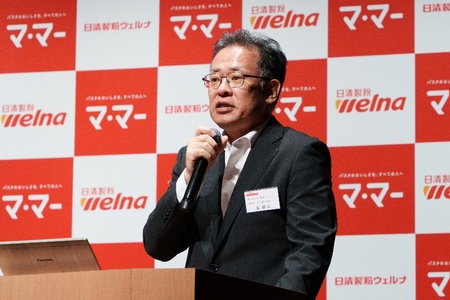 そして、岩橋の説明にもあった「生パスタ新市場の創造」について、伊藤は消費者へのアンケート調査を挙げて生活者がパスタに求める食感・嗜好性の拡がりを指摘した上で、「家庭用でのもちもち生パスタの市場ポテンシャルは大きい」と説明。国内パスタ市場は約9割が「乾麺」で「生パスタ」の構成比はまだ低いが、外食では生パスタ専門店の増加もあり市場は拡大傾向にあることなどを踏まえて、「当社は、パスタ元年以来、日本の食卓におけるパスタの浸透をリードしてきた。これからも、パスタを熟知したマ・マーだからこそできる、生パスタの展開で、新たなパスタ文化を創造する」と説明し、家庭で楽しむ生パスタ市場の拡大に意欲を示しました。