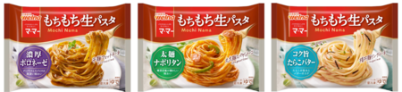 冷凍食品の「マ・マー もちもち生パスタ」シリーズ(濃厚ボロネーゼ/太麺ナポリタン/コク旨たらこバター)は、人気外食店の生パスタを徹底的に研究した上で、試作を100回以上繰り返しながら「コシ」と「粘り」のある「もちもち食感」を追求。ソースに合わせて最適な麺の形状を選定した上で「麺線押し出し製法」を採用したことで、4種類の麺線にしっかりと絡む濃厚ソースを最後の一口まで楽しむことができます。