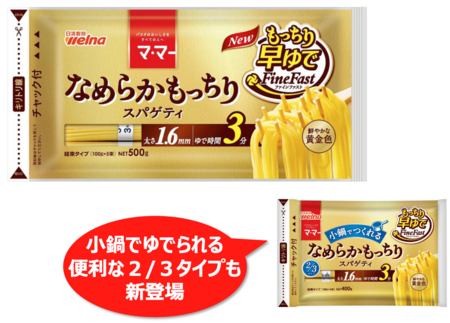 また、既存製品のリニューアルでは、茹で時間3分で時短調理を可能にしている「マ・マー なめらかもっちり早ゆでスパゲティ」が登場。乾麺の形状を変更し、外側をより柔らかくして適度に芯を残しつつ、3分のゆで時間でもさらにもっちりとした食感へリニューアルしました。加えて、小鍋でも調理が可能な「長さ2/3サイズ」も新登場します。