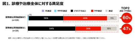 今回の調査の結果、診療や治療全体に対する満足度は、薬物療法を経験したことのある患者さんが計60%(満足11%、やや満足49%)で、薬物療法を経験したことのない患者さんの計47%(満足18%、やや満足29%)よりも、高い傾向にありました【図1】。