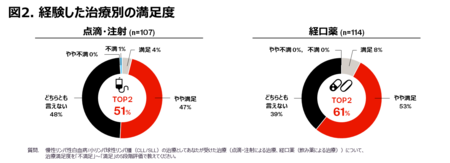 また実施した治療に対する満足度は、点滴・注射での治療に対する満足度の計51%(満足4%、やや満足47%)よりも、経口薬での治療に対する満足度の方が10%高く、計61%(満足8%、やや満足53%)でした【図2】