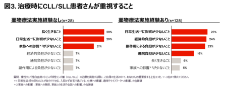 またCLL/SLLの治療時に生活の中で重視することを尋ねたところ、これまで薬物療法を行ったことのある患者さんでは、「日常生活**への影響が少ないこと」が25%、「経済的負担が少ないこと」が24%で、この2項目を合わせ、計49%と約半数の患者さんが普段と変わらない生活を可能な限り維持し、また経済的な側面での負担も少ない治療を望んでいました。一方、薬物療法の経験がない患者さんでは、「日常生活への影響が少ないこと」と、「長く生きること」がともに29%で最も多くを占めました【図3】。