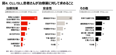 そして患者さんがCLL/SLLの治療薬に求めることについて、全体を100点として治療効果、安全性、その他の3項目について点数化してもらいました。その結果、3項目の平均点はそれぞれ、「治療効果」が47点、「安全性」が43点、「その他」が10点でした。各項目の下位項目では、「治療効果」の中では、「病気になる前の生活が維持できること(45/100点、平均点)」、「安全性」の中では、「感染症が少ないこと(43/100点、同)」、「その他」では、「外来で治療できること(39/100点、同)」が最も高いという結果でした【図4】。
