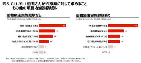 さらに「その他」の下位項目を薬物療法経験別で分析したところ、薬物療法の経験がない患者さんでは、「外来で治療できる」が35点と最も高く、「治療期間が決まっている」で21点、「経口薬(飲み薬)」である」が18点という結果でした。薬物療法の経験がある患者さんでは、「外来で治療できる」が40点と最も高く、次いで「通院頻度が少ない」で21点、「治療期間が決まっている」が16点で、薬物治療経験の有無に関わらず、「外来での治療」や「治療期間」、「通院頻度」といった項目もCLL/SLLの患者さんが治療薬に求めることとして挙げられていました【図5】。