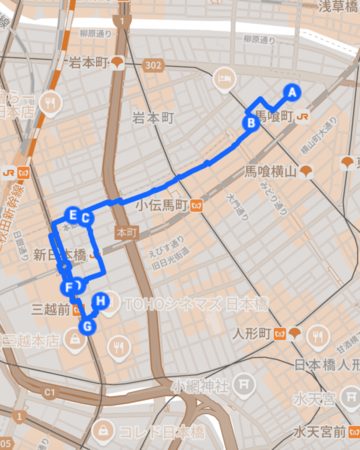 おすすめコース 【馬喰町〜日本橋】所要時間(鑑賞含め3時間半程)ルートマップ