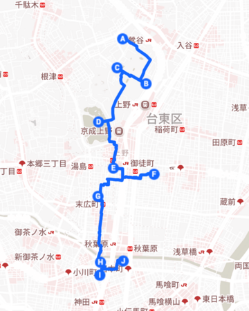 おすすめコース 【上野〜神田〜馬喰町】所要時間(鑑賞含め5時間程)ルートマップ