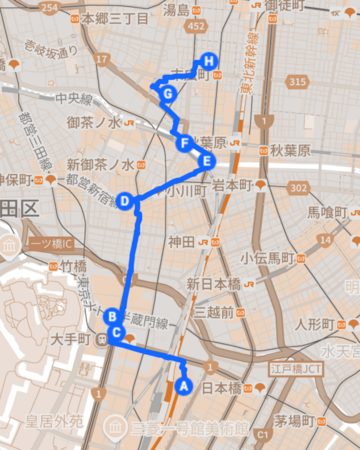 おすすめコース 【大手町〜神田〜秋葉原】所要時間(鑑賞含め3時間半程)ルートマップ