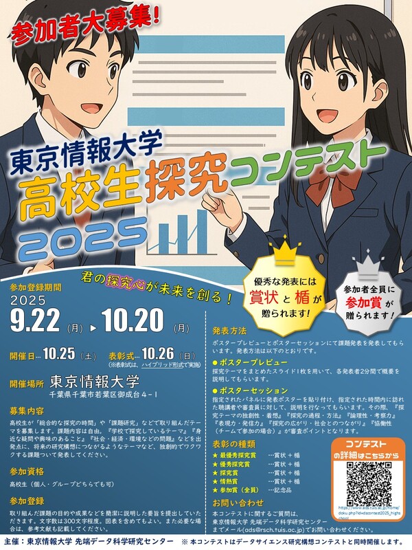 東京情報大学(設置者:学校法人東京農業大学)総合情報学部の先端データ科学研究センターでは、高校生探究コンテストを10月25日~26日に開催します。