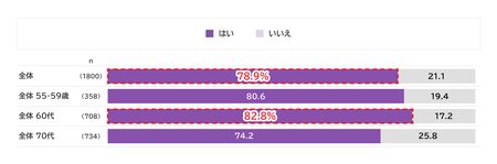 50代後半は「孤独」や「離婚」を意識するなど老後に向けて不安や迷いを感じており、反応に男女差はあるものの、人生の転換期における心の揺れが垣間見えます。しかし、高齢でも「新しいことに挑戦したい」シニアは多く、還暦後は「人生の点数」も高得点になり、新しい楽しみや役割を見つけて前向きに過ごすのが令和シニアらしい生き方となっています。