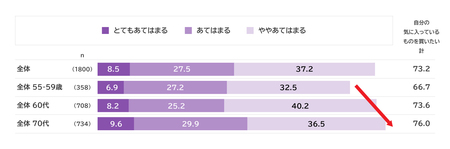 ・「今後の人生をもっと良いものに変えたいと思っている」シニアの割合は78.9%で、60代(82.8%)でピークを迎える。「多少高くても自分の気に入ったものを買いたい」という割合は73.2%と、年代とともに増加し、人生をより良くし、そのために消費をしたい意向がうかがえる。【図表8】【図表9】