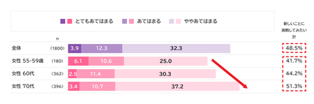 ・「新しいことに挑戦してみたい」と思う割合は、48.5%。女性は、55~59歳では41.7%と後ろ向きだが、60代では44.2%、70代は51.3%と年代の上昇に伴い増加する。【図表10】