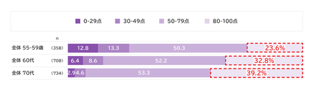 ・自分の人生に点数を付けるとしたら、「80-100点」と回答した割合は、55~59歳で23.6%、60代で32.8%、70代で39.2%と、年代とともに高くなる。【図表11】