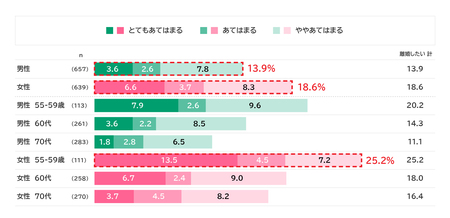 ・「孤独を感じることが多い」割合は、55~59歳男性で35.6%、55~59歳女性で37.2%と、いずれも55~59歳が最も高く、60代(26.5%)とは約10ポイント、70代(19.0%)とは約17ポイントの差がある。【図表1】