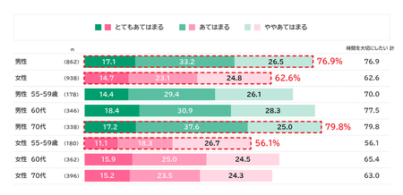 ・「妻/夫/パートナーとの時間を大切にしたい」という男性は76.9%に対し、女性は62.6%。割合が最も高いのは、70代男性(79.8%)で、最も低いのは55~59歳女性(56.1%)。【図表4】