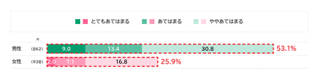 ・「モテたい」と思う男性は53.1%なのに対し、女性は25.9%と男性の半数以下にとどまる。【図表5】