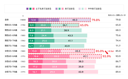 ・「今あるものを処分したい、整理したい」と回答した割合は、全体で79.8%。女性は60~64歳女性(93.9%)で片づけたい意欲がピークを迎え、55~59歳女性(85.0%)と比較すると8.9ポイント増加する。最も意欲が低いのは55~59歳男性(65.0%)。【図表7】