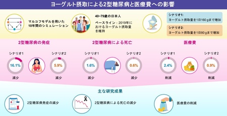 ヨーグルトを1日160 g摂取することで、10年間で2型糖尿病の発症が16.1%減少する可能性があり、糖尿病関連の医療費が2.4%(約1,440億円)削減できる可能性が示唆されました。