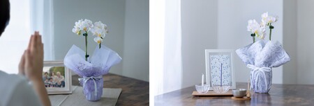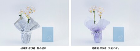 商品名 :「胡蝶蘭 偲び花 銀の祈り」、「胡蝶蘭 偲び花 淡紫の祈り」