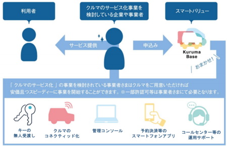 スマートバリューは、「WAKITA Self Rental」にシェアリングプラットフォーム「Kuruma Base」を提供することで、24時間365日の無人出庫対応を実現します。