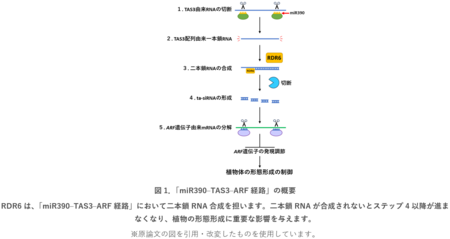 植物における重要な遺伝子発現調節の仕組みの一種です。TAS3配列から生成されるRNAが、miR390(遺伝子発現を制御する効果を持つ一本鎖RNAの一種)という低分子RNAを利用して切断され、そのRNAを鋳型としてRDR6が二本鎖RNAを生成します。この二本鎖RNAが切断されることでta-siRNAが生成されます。これらのta-siRNAはARF遺伝子(オーキシン応答因子)の発現を調節し、葉や花などの器官形成に重要な役割を果たします。この経路が正常に機能することは、植物の形態や発育に不可欠です。
