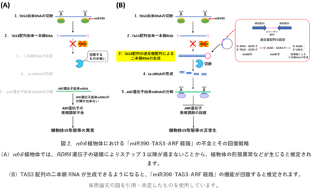 この経路では、まずTAS3と呼ばれる特定のDNA配列から一本鎖RNAが合成された後に、miR390(遺伝子発現を制御する効果を持つ小さな一本鎖RNAの一種)が認識する配列部分で切断され(ステップ1)、TAS3配列由来一本鎖RNAが生成されます(ステップ2)。切断されたRNAをもとに二本鎖RNAが合成され(ステップ3)、その後、ta-siRNA(トランス作用性低分子干渉RNA)へと加工されてARF遺伝子由来mRNAの分解を誘導することでその発現を制御します(ステップ4~5)。RDR6はステップ3「二本鎖RNAの合成」に必須の酵素です。しかし、rdr6植物体ではRDR6遺伝子が破壊されているため、TAS3配列から二本鎖RNAを生成することができません。その結果、rdr6植物体では「miR390–TAS3–ARF経路」が正常に機能せず、ARF遺伝子の発現制御ができていないと推定されました。このことが、rdr6植物体において植物体の矮小化や種子形成の異常といった形態的な欠陥を引き起こしている原因であると推定されました(図2A)。