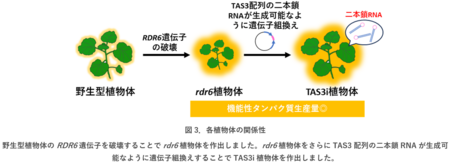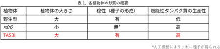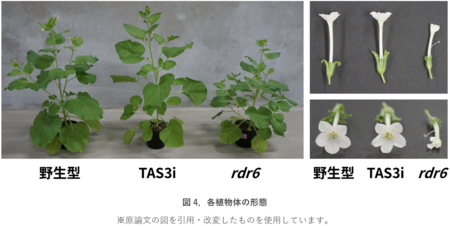 ・ 植物での機能性タンパク質生産において障害となる「RNAサイレンシング機構」を抑制したrdr6植物体において、TAS3と呼ばれるDNA配列から二本鎖RNAが作られなくなることで生じる矮小化や不稔を解消