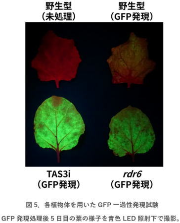 野生型、rdr6、TAS3i各植物体を用いて、緑色蛍光タンパク質(GFP)の一過性発現を試みたところ、GFP発現処理した野生型植物体ではGFPの蛍光がごく弱くしか観察されないのに対し、GFP発現処理をしたrdr6植物体およびTAS3i植物体ではいずれも非常に強いGFP蛍光が観察されました(図5)。これは、TAS3i植物体においてGFPが大量に生産されていることを示しています。