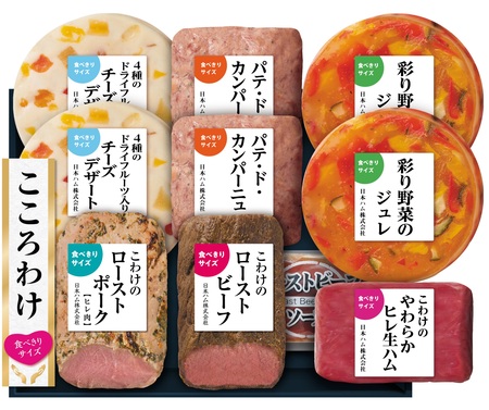 今年のお中元で発売した『こころわけ 冷製オードブルセット』に、今回は新たに「パテ・ド・カンパーニュ」「4種のドライフルーツ入りチーズデザート」を加え、盛り付けるだけでオリジナルの洋風おせちセットや洋風おつまみセットができる洋惣菜アソートにしました。少人数世帯やご夫婦世帯(親世帯)への贈り物にも最適です。