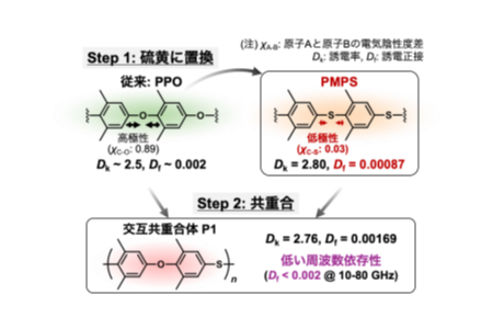 そこで、研究グループは、従来の低誘電材料であるPPOの酸素原子を硫黄に置換したジメチル置換PPS (PMPS) と、これらの交互共重合体※13 P1に新しく着目しました (図1)。