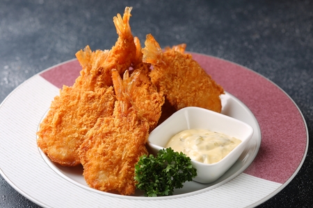 ふっくらとした肉厚な海老を背開きにし、揚げたてを提供。サクサクの衣とジューシーな身が魅力です。一口ごとに海老の甘さが口いっぱいに広がります。