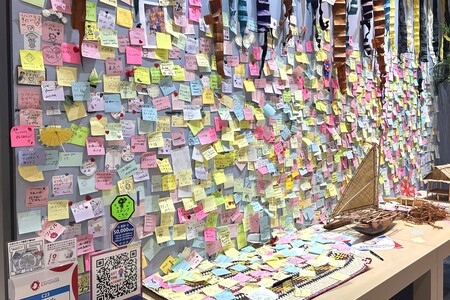 展示を眺めるだけでなく、自らの言葉を「残す」体験。派手な演出があるわけではありませんが、その静けさが、深い集中を生み出します。「持続可能な世界に」「アルジェリアに幸あれ」「世界中が仲良くなれますように」などと展示を見た感想、自分の希望、誰かへの励ましの言葉が、穏やかに壁を彩っています。会場内は比較的ゆったりとしており、ほとんどの来場者が足を止め、時間をかけて思いをつづっていく姿が印象的でした。