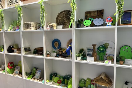 世界で3番目に小さな島国・ナウル。コモンズB館のナウルパビリオンでひときわ目を引くのは、展示を埋め尽くすほどの「ナウルくん」のファンアートです。ナウルの国土を模したこの公式キャラクターへの愛が、SNS上での呼びかけをきっかけに、来場者から数多く寄贈され、展示棚を彩っています。
