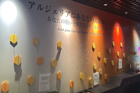 「アルジェリアにあなたの光を加えてください」。その言葉の下、訪れた人々が次々とペンを取り、自分の願いをそっと書き込んでいきます。セービングゾーンのアルジェリアパビリオンでは、来場者が六角形のカードに自由に想いをつづり、壁に飾っていくメッセージスペースが設けられています。