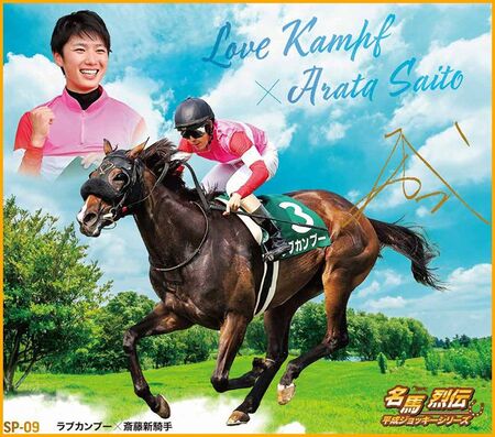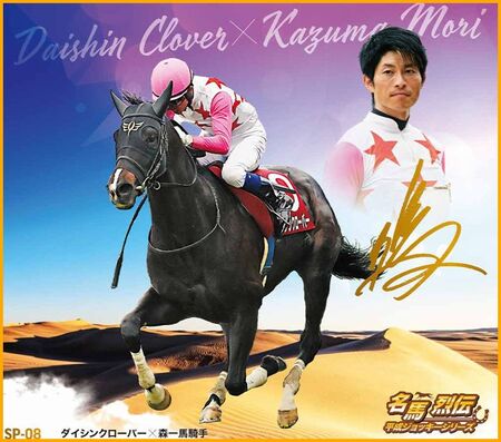どの絵柄が出てくるかは開封してからのお楽しみのシークレット仕様のパッケージ。激レアで、騎手本人が直筆でサインしたミニ色紙もあります。