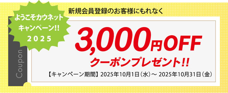 新規登録をしていただいたお客様には、登録完了後すぐにウェブでのお買い物に使える3,000円分のクーポンをお届けします。この機会にぜひ、豊富な商品ラインナップをお試しください。