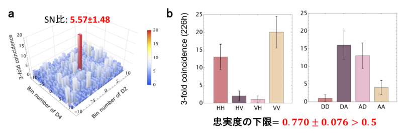 その結果、和周波光子の信号は高いSN比で検出され(図3a参照)(先行研究[2]と比較して約1桁近く高いSN比を達成)、終状態に強い量子もつれが存在していることを確認し(図3b参照)(最大量子もつれ状態との忠実度の下限を推定すると0.770±0.076)、世界で初めて単一光子間の和周波発生による量子もつれ交換の実証に成功しました。