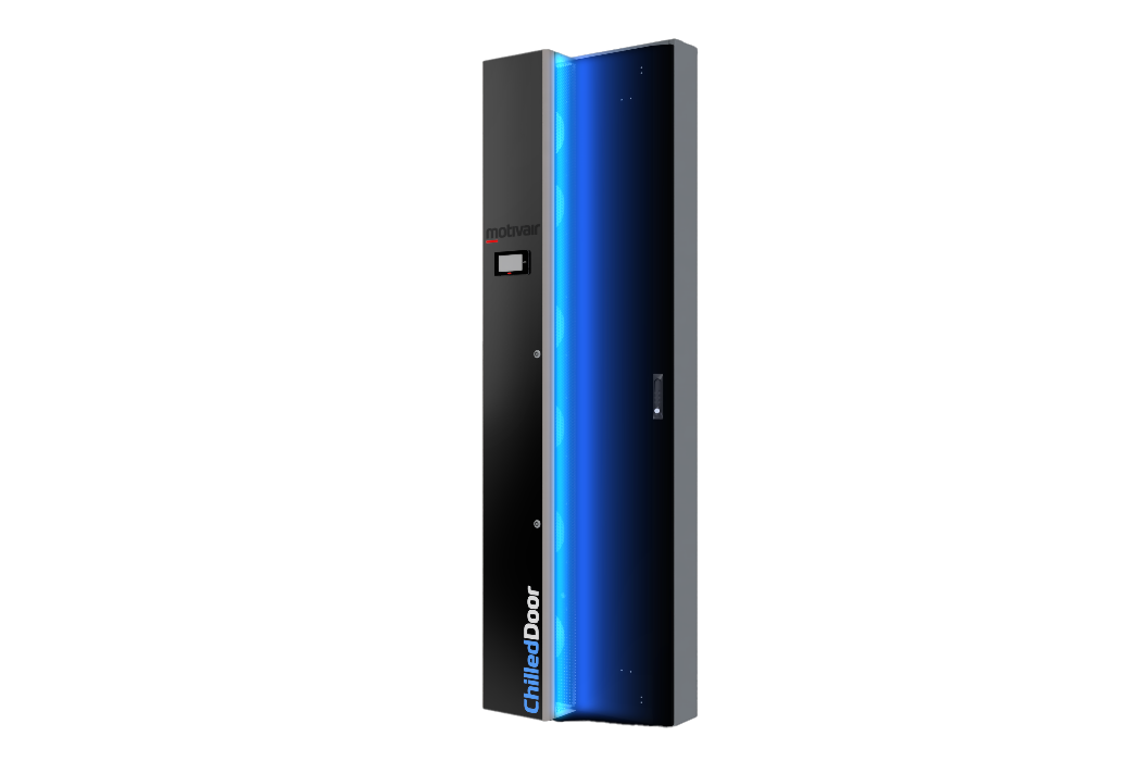 リアドアという名称のとおり、サーバーラックの背面扉として搭載することができる空冷の装置。コールドプレートで除去しきれない熱を空気で冷やす。薄型でスリムな空調機であるため、設置面積が小さく、ホワイトスペースを節約できる。