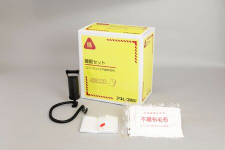 『睡眠セット』のエアーマットは、付属のポンプで空気を入れるとチューブが大きく膨らみ、十分なクッション性を確保。硬い床での身体への負担を和らげるとともに底冷えを緩和します。大人がゆったり横になれるサイズで、枕部分が自動的に形成される独自構造となっています。耐久性にも優れ、繰り返し使用可能です。不織布毛布は軽量でありながら一般的なフリース毛布と同等の保温性能を備えています。
